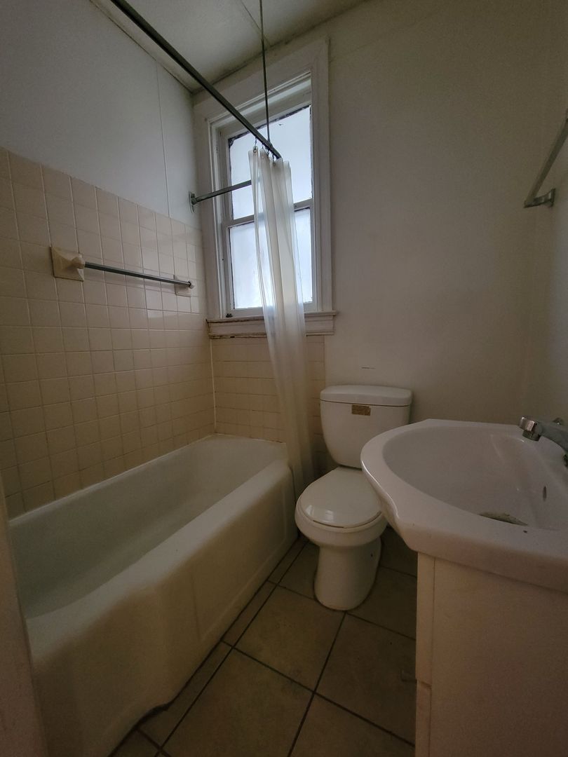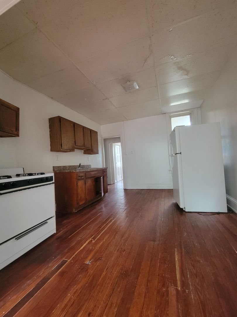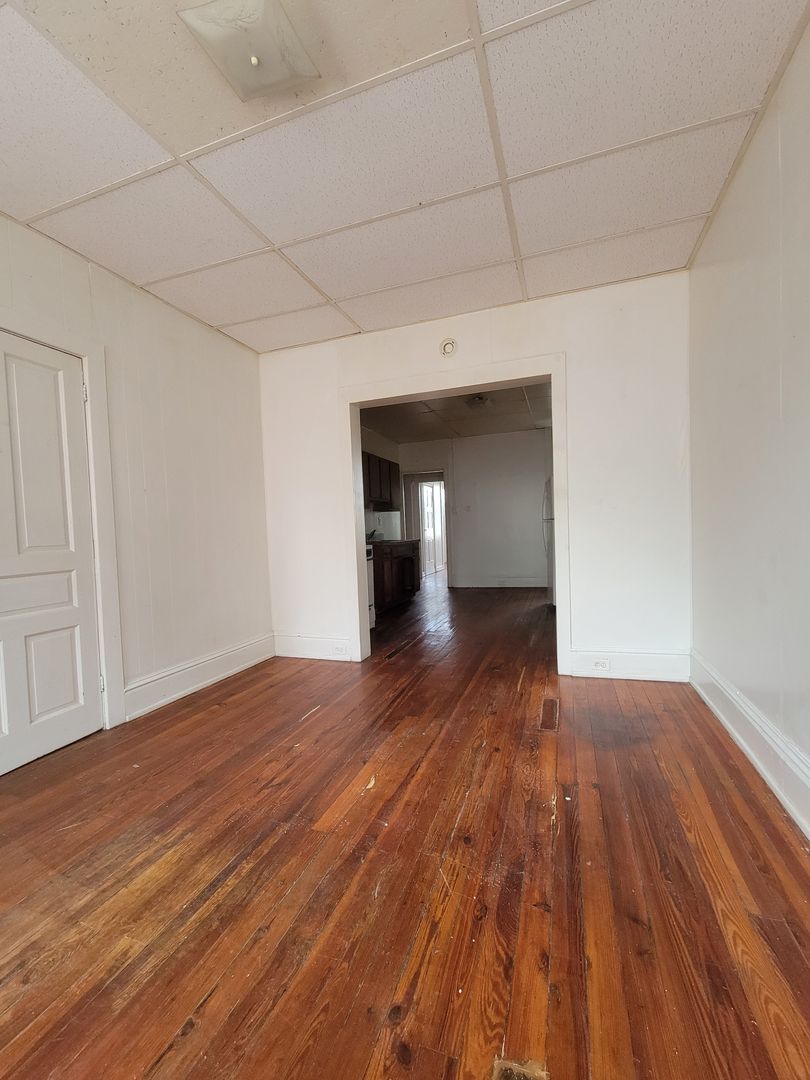 First floor 1 bedroom 1 bath apartment with tub & shower. Small eat in kitchen with stove, fridge. Wood floor. Nice size rooms.